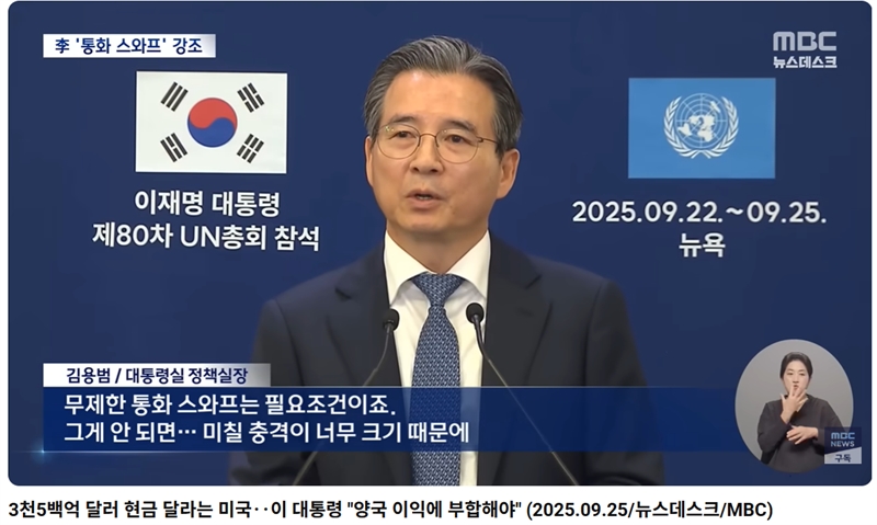 ▲ 이재명은 통화스와프가 안 되면 관세협상을 안 할 것처럼 국민에게 다짐해 놓고 보란 듯이 짓밟았다(편집인 주). 자료: 문화방송보도 발췌