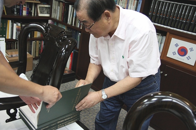 ▲서재에서 사료집 몇 권을 직접 꺼내 보여주는 이종찬 전 국정원장