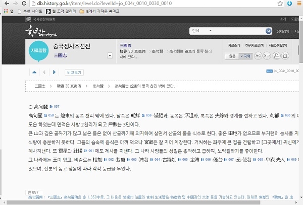 국사편찬위원회가 운영하는 <한국사데이터베이스>는 한국사 관련 자료 원문을 볼 수 있는 사이트 입니다. 통사, 고대, 고려시대, 조선시대, 대한제국, 일제강점기, 대한민국 등의 카테고리로 분류가 되어 있습니다.'고대 -> 중국정사 조선전 -> 삼국지' 편의 고구려 기사입니다. 전문 번역 및 각주에 자세한 해설을 볼 수 있습니다. 한국사데이터베이스 : http://db.history.go.kr/ 0 0 삼태극 임진혁 koreahiti@daum.net 임진혁의 기사 더보기 저작권자 ⓒ 삼태극, 무단 전재 및 재배포 금지