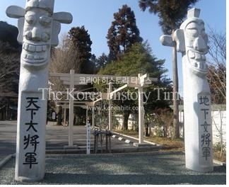▲고려신사를 수호하는 장승-원래는 목제로 되어있었으나 훼손되어 화강암으로 다시 세웠다.고려신사의 대표인 궁사(宮司) 고마 시즈오(高麗澄雄)와 그 아들 고마 후미야스(高麗文康)는 모두 고려를 성씨로 쓰고 있다. 이들은 고구려 왕족 약광(若光:잣코)의 후예들이다. 고려신사는 사이타마현 히다카(日高)시에 있는데, 히다카시의 과거 이름은 고려군(高麗郡)이었다. 고려신사에서 발간한 고려신사의 창건 경위(高麗神社創建の経緯)에 따르면 현재의 시즈와카(静岡)현에 있던 스루가노국(駿河國:스루가노쿠니)에 살던 고구려 유민 1799인이 716년에 무장국(武藏國)으로 이주해서 고려군을 설치한 것이 시초라고 한다. 초대 군사(郡司)는 약광이었는데, 일본서기 천지(天智)기에는 약광이 고구려에서 왔다고 기록하고 있다. 이들 고마 가문은 현재도 「고려씨계도(高麗氏系圖)」라는 족보를 가지고 있는데, 이에 따르면 고마 후미야스는 약광의 60대 후손이다.