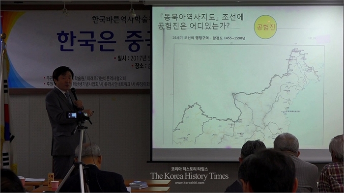 ▲ 이덕일 한국바른역사 학술원장이 동북아역사재단에서 제작한 지도를 비판하고 있다. 소중화 조선의 세종시기 동북국경선이 두만강 선으로 그려져 있는 것은 명백한 일제식민사관에 따른 것이라고 했다. 공험진은 두만강 북쪽으로 7백리에 있는데 이것이 제외되었다고 했다.이에 대하여 서기2017.5.19. 서울시 서대문구 독립공원내의 순국선열유족회 지하강당에서 열린 미사협(미래로가는바른역사협의회) 산하, 바른역사학술원 학술대회에서 반박주제발표가 있었다. 동북아역사재단의 매국적 행태를 수년동안 책과 강의로 고발해 온 바른역사 학술원장, 이덕일 한가람역사문화연구소장이 이날 동북아역사재단의 이 같은 행태를 비판하고 나섰다. 이 학술원장은 서기2014년에 낸 <우리안의 식민사관>에서 이 문제를 자세하게 다룬바 있다. 이 책에서도 소중화 조선말까지 우리나라 국경선이 현재의 두만강-압록강선이 아니라 훨씬 북쪽으로 그려져 있다고 중국측 자료와 우리나라 사료를 제시하며 증명한 바 있다.