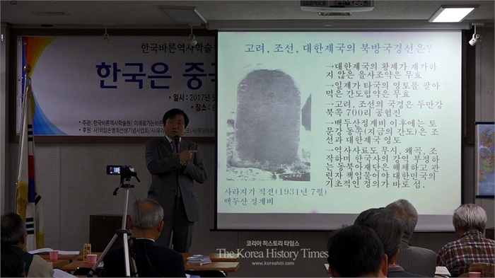 ▲ 백두산 정계비는 간도가 우리 땅임을 증명하고 있다. 이날 이덕일 학술원장은 역사를 팔아먹는 자는 반드시 나라도 팔아먹는다며, 강단주류사학과 동북아역사재단이 흐려놓은 우리역사에 대한 쟁점을 명확하게 정리했다.현재 압록강과 두만강으로 하는 선은 일제가 만들어 준 것이라는 것이다. 즉 서기20세기 초에 창작된 것이다. 그럼에도 불구하고 소중화 조선 초기 세종이 이른바 4군 6진을 개척하고 확정했다는 국경선을 북으로는 두만강 선으로 그려놓고 있다. 이것은 명백한 식민사관에 입각한 국경선이다. 서기20세기 초에 일제가 강제로 만든 국경선을 서기15세기까지 거슬러 올라가 당시의 국경선이라고 한 것이다. 이 식민사관에 입각한 국경선을 동북아역사재단이 발주한 동북아역사지도집에 그대로 그려놓았다. 지도집 제작에 참여한 한국고대사학회가 주축이 되어 이렇게 그린 것이다.