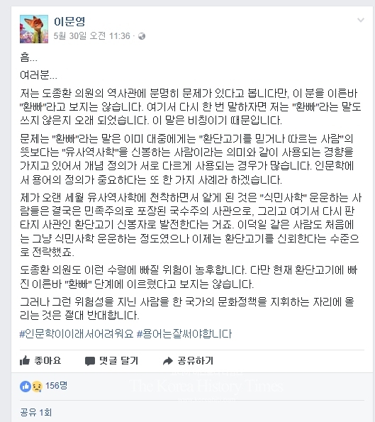 식민사학청산 주장하는 도종환 의원 입각저지에 사활 걸다.