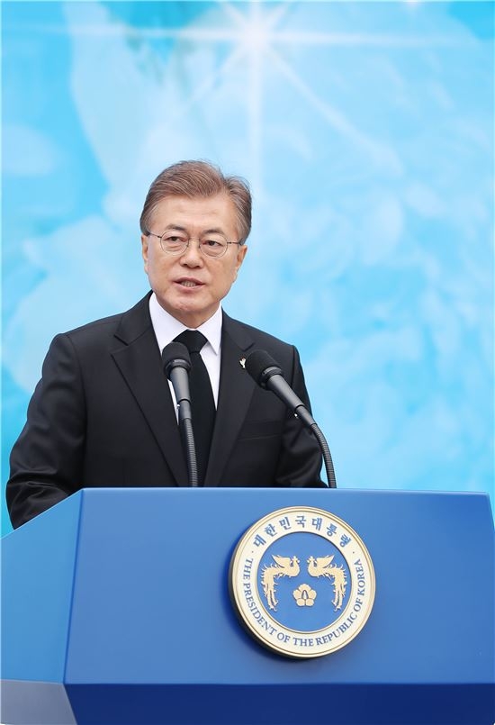 ▲ 문재인 대통령이 제62회 현충일을 맞이하여 서기2017.6.6. 동작동 국립묘지에서 추념사를 하고 있다. 문 대통령은 이날 추념사에서 대한민국의 뿌리는 독립투쟁사에 있다고 분명히 했다. 그리고 이 정신이 현재의 태극기에 새겨져 있다고 역설했다. 이어 애국을 하면 보상을 받고 반역을 하면 댓가를 치르게 하는 대한민국을 만들겠다고 다짐했다. 사진=청와대 공동취재단