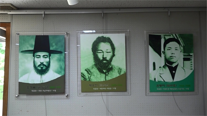 ▲ 서울시 서대문구 독립공원내에 위치한 순국선열기념관 지하강당에 초라하게 걸려있는 한말 의병장들. 이 영령들은 현재 제도권 강단식민사학자들이 추종하고 있는 일제의 잔악한 학살에 맞서 젊은 피를 뿌렸다. 소개 내용을 보면 모두 30세 전후다. 이들이 두렵지 않는가, 식민사학 매국노들이여, 이 순국선열들의 이름을 한번이라도 들어 보았는가, 식민사학의 매국질을 꿰뚫어 보고 청산하겠다고 나선 도종환 의원을 유사, 사이비역사학자로, '한단고기'를 추종하는 '환빠'라며, 사상 검증, 검열에 나선 조선총독부 밑에서 개, 돼지 노릇하던 자들의 학맥을 있고 있는 자들이여...