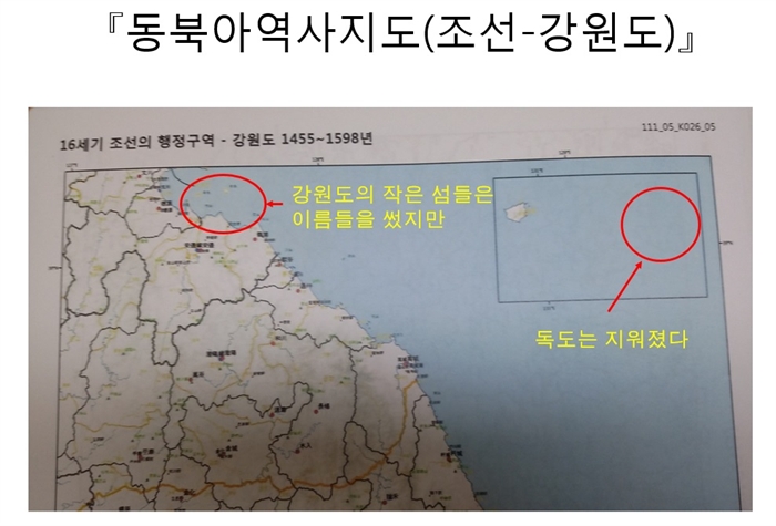 이 사태를 심각하게 생각한 국회 동북아역사왜곡 특위에서 2015년 지도제작 책임자와 나를 불러 회의를 개최했다. 지도제작 책임자였던 임기환 서울교대 교수는 왜 독도를 누락시켰느냐는 질문에 “실수”라고 답변했다. 60여명의 학자들이 8년간 그린 지도에 독도가 일관되게 삭제되어 있었다면 과연 실수일까?