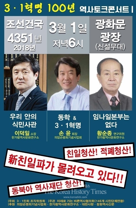 ▲ 올해 3.1절에 역사강연대회가 광화문 일대에서 열린다. 그런데 이번 동북아역사재단 이사장, 김도형이 드러내놓고 단재 신채호 역사관으로 국사복원하자는 민족사학세력을 '유사역사학집단'이라고 매도했다. 더구나 매국역사지도집제작한 조선총독부 식민사관 세력과 손잡고 지도제작 재개를 선언했다. 이번 사태가 불씨가 되어 매국질을 일삼는 동북아역사재단 해체와 김도형 탄핵, 조기퇴진으로 이어질 전망이다(편집자 주).*친일청산, 적폐청산, 동북아역사재단 청산