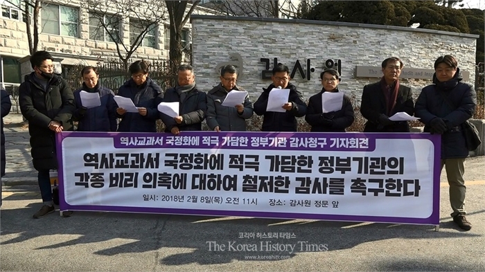 ▲ 서기2018.02.08. 서울 삼청동 감사원 앞에서 한국역사학계와 고고학회 및 기타 역사관련 14단체들을 대표해서 8명 인사들이 동북아역사지도집제작사업 재개 감사청구 기자회견을 가졌다. 왼쪽 두번째부터 하일식, 오수창, 한창근, 이진한, 백경식, 박찬승, 홍종욱. 이날 기자회견문은 이진한 고려대 교수, 배경식 역사문제연구소 이사가 나눠읽었다(편집자 주).*독도 사라진 한반도기