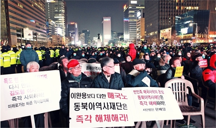허 전 장관이 재단 치부 정곡을 찌를 때마다 시민들이 공감하며 큰 함성으로 힘을 실어주었다. 날씨가 얼마나 추운지 그의 입이 얼어 발음이 잘 나오지 않을 정도였다. 그럼에도 연사는 꾹꾹 눌러 정확하게 발음하려 애썼다. 힘주어 동북아역사재단의 매국반역행위를 고발했다. 손자 재롱을 보며 편안하게 보낼 시간에 누가 이 노학자를 엄동설한에 식민사학해체투쟁으로 내 몰고 있는가, 조선총독부 식민사관이 지배하고 있는 역사적폐를 청산하지 않은 대한민국이다. 문재인 정권이다.
