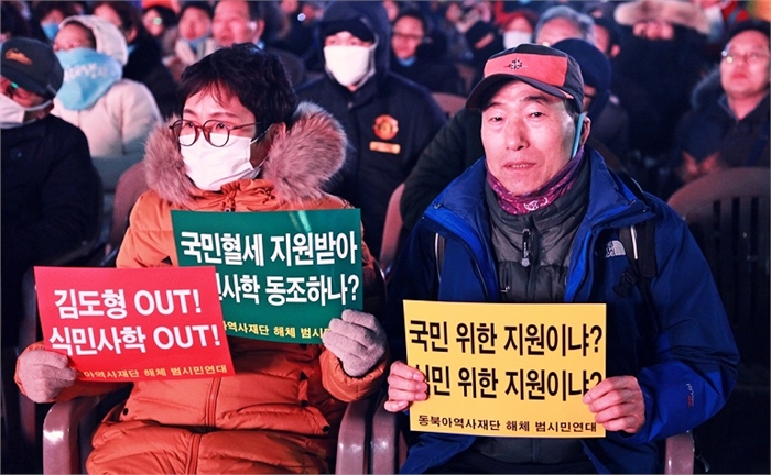 ▲서기2018.03.01. 서울 광화문 광장에서 동북아역사재단해체 규탄 및 시민행동 궐기대회가 열렸다. 영하4도를 훨씬 웃도는 추운 날씨에도 불구하고 1천여명 가까운 시민들이 행사장을 가득 채운 가운데, "김도형 이사장 즉각 해임", "동북아역사재단해체"를 목이 터져라 외쳤다. 사진: 오마이뉴스, 조우성 http://www.ohmynews.com/