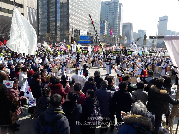 ▲서기2018.03.01. 서울 광화문 광장에서 동북아역사재단해체 규탄 및 시민행동 궐기대회가 열렸다. 영하4도를 훨씬 웃도는 추운 날씨에도 불구하고 1천여명에 가까운 시민들이 행사장을 가득 채운 가운데, "김도형 이사장 즉각 해임", "동북아역사재단해체"를 목이 터져라 외쳤다. 사진: 오마이뉴스, 조우성 http://www.ohmynews.com/3.1만세혁명이 결국 8.15 광복으로 이어졌다고 역사는 평가한다. 이제 광복된 나라에서 다시는 외세에 나라를 뺏기지 말자는 다짐과 조국광복을 위해 희생한 순국선열들의 뜻을 새기는 날이었다.