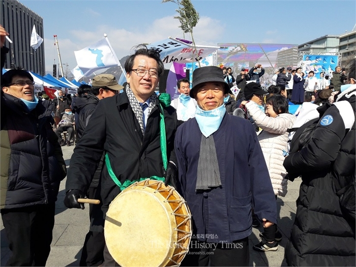 ▲3.1민회 조직위원회는 이날 오전 10시에 종로 탑골공원에서 출발하여 광화문 본 행사장 까지 북을 두드리며 행진했다. 행진을 마치고 행사 마당에서 다시 북을 두르리며 판을 벌였다. 왼쪽 북을 두른 이가 손윤 미사협(미래로 가는 바른역사 협의회-상임대표 허성관 전 행자부 장관) 공동대표, 오른 쪽이 황선진 3.1민회 조직위원회 공동대표. 손윤 공동대표는 이날 동북아역사재단 해체 시민행동 역사강연대회에서 3번째 연사로 참여했다.허 전 장관은 이어 재단이 어떻게 반역행위를 버젓이 일삼고 있는지 세번째 근거를 밝혔다. 또 조선총독부 식민사학이 얼마나 뿌리가 깊은지 실상을 드러내면서 식민사학자들의 오만 불손함과 이들을 역사관련 주요 3개 국가기관 장으로 임명한 현 정부를 질책했다.