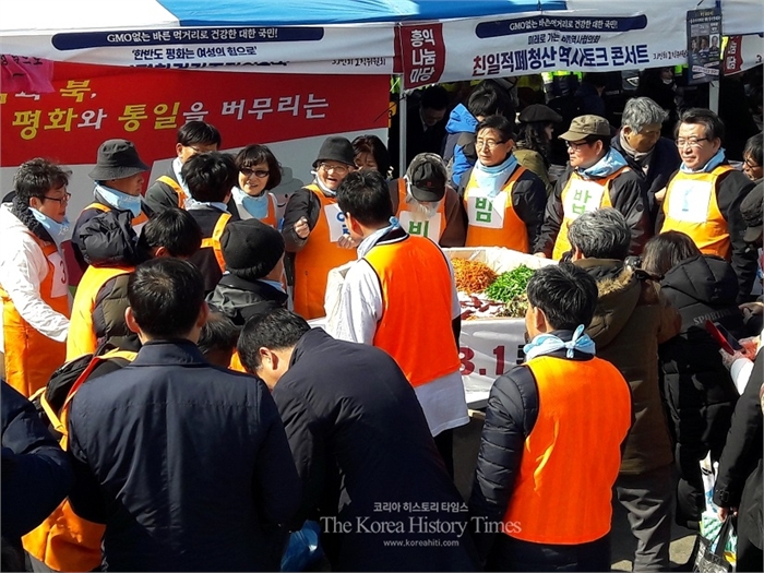 ▲ 이날 3.1민회 조직위원회, 동북아역사재단해체 범 시민연대를 중심으로 참여한 시민들에게 즉석에서 비빔밥 나눔행사를 벌였다. 오방색 나물로 만든 비빔밥은 통합과 화합, 조화를 상징한다. 평화와 통일을 버무려서 갈등과 분열을 넘어 홍익인간을 회복하는 소망을 담았다.이어 현 정권의 잘못된 인사행정을 질타하면서 '모르면 물어봐야 할 것 아니냐'며 매국행위를 일삼는 인물을 기관장에 앉힌 것에 분통을 터뜨렸다.