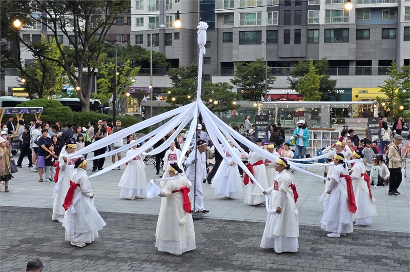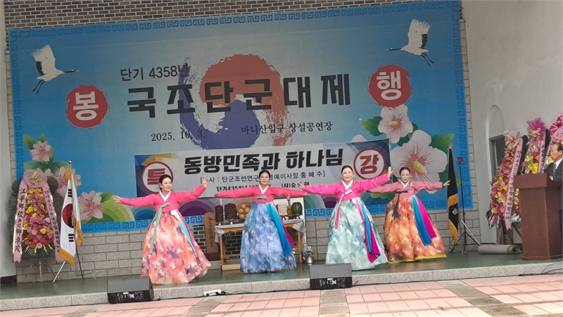 ▲단군기원 4358.10.03. 서울 서대문구 서대문 공원에 위치한 순국선열사당의 독립관 앞에서 개천절 민족공동행사 준비위원회가 주최한 개천절 경축식 공연. 자료: 이정희