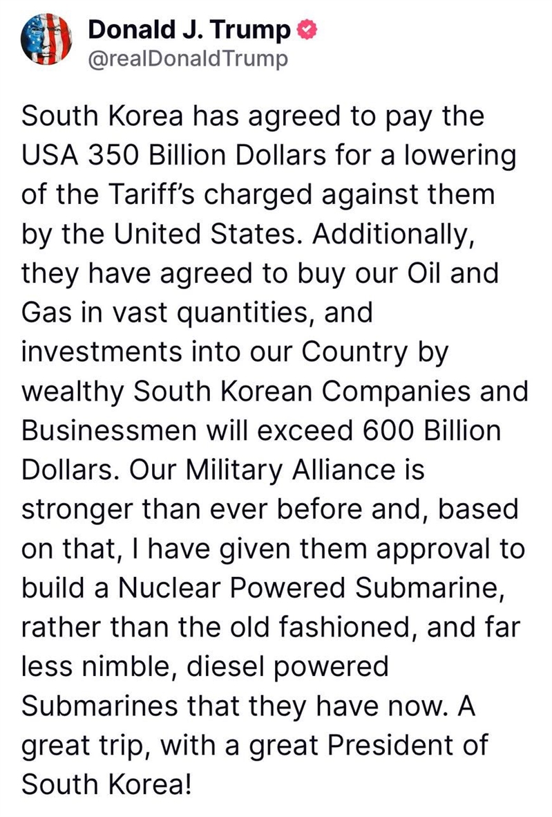 문제는 한국 정부 발표와 트럼프의 발표가 너무 다르다는 것이다. 트럼프가 개인 통신망(Truth Social)에 올린 글을 보면 한국 정부가 발표한 것 외에 투자하는 것이 또 있다.
