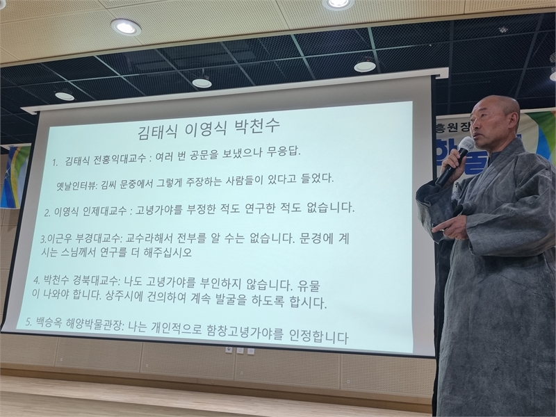 지정스님은 발표 끝물에서 그동안 투쟁해 온 결과를 내왔다. 고녕가야를 정부와 역사학을 장악하고 있는 기득권 역사학자들에게 물었고 반응이 나왔다.