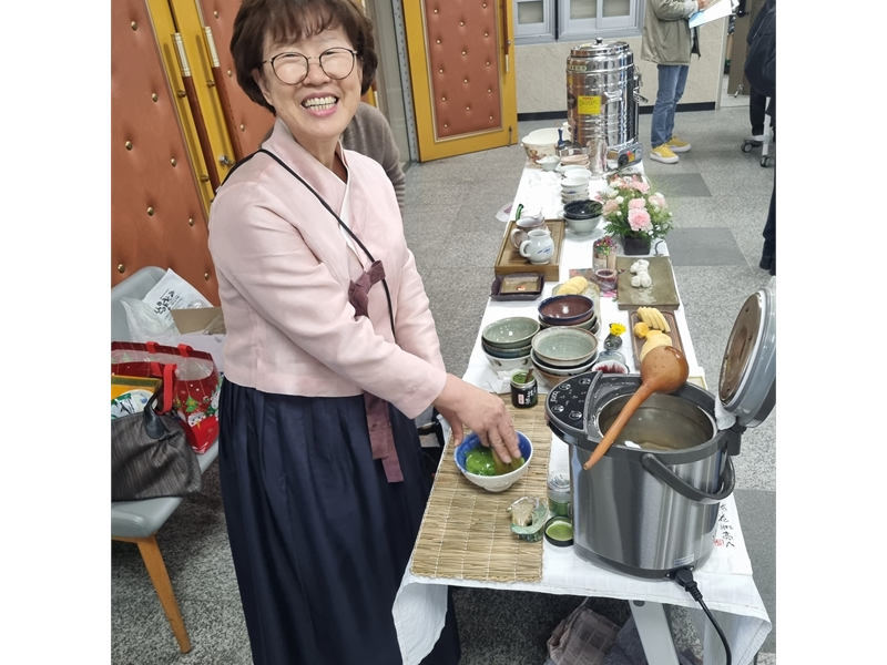 ▲ 새재다리원에서 활동하고 있는 전 문경인터넷뉴스 대표 이민숙님. 국산 말차를 참석자들에게 대접하면서 환하게 웃으셨다. 자료: 삼태극