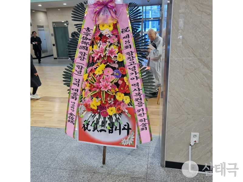 ▲고녕가야국 함창 김씨 대종회에서 축하 화환을 보냈고 참석자들 모두에게 종친회 글이 새겨진 고급 볼펜을 선물하였다. 자료: 삼태극