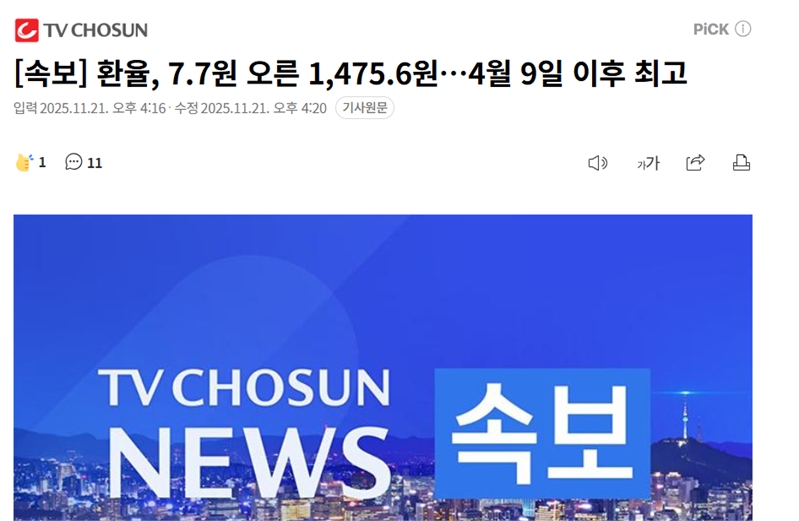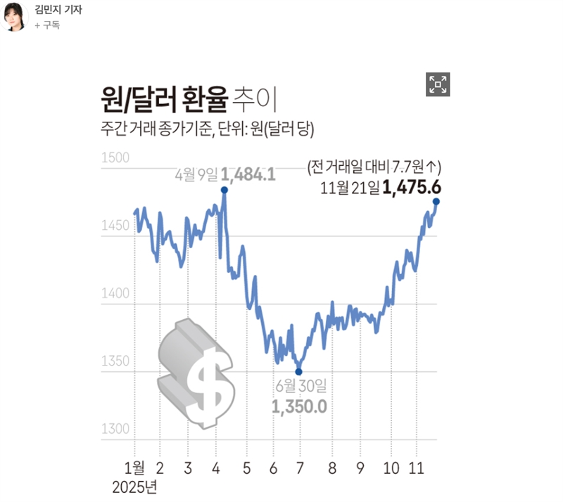 6월까지만 하더라도 1천3백원 초반대에서 오르락내리락하였다. 매국 조약이 구체화하는 7~8월 들어면서 서서히 오르기 시작하더니 경주 아시아태평양경제협력체(APEC) 모임에서 이재명이 트럼프와 매국 관세조약을 발표한 이후 1천4백 원대로 가파르게 치솟았다.