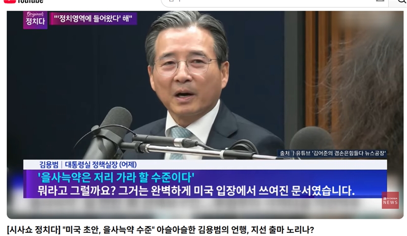 ▲티비조선은 서기2025.11.20. 대통령실 정책실장, 김용범이 유튜브'김어준의 겸손은 힘들다 뉴스공장'에 나가 관세협정안이 '을사늑약은 저리 가라 할 수준이다'라고 말하였다고 보도하였다. 자료: 티비조선 방송 발췌.