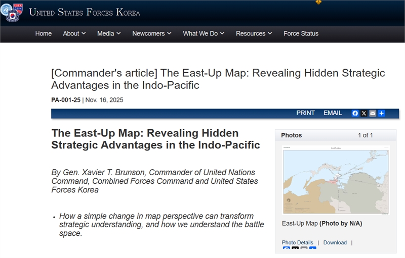 ▲미국의 주한미군 사령관 브런슨(Gen. Xavier T. Brunson, Commander of United Nations Command, Combined Forces Command and United States Forces Korea) 은 서기2025.11.16. 주한미군사령부 누리집에 글을 올려 한국은 미국의 군사기지로써 미국의 최전방에 있다고 하였다. 지도를 보면 남한에서 배트남, 필리핀, 대만, 북경 등 까지 거리를 표시해 놓고 있다.