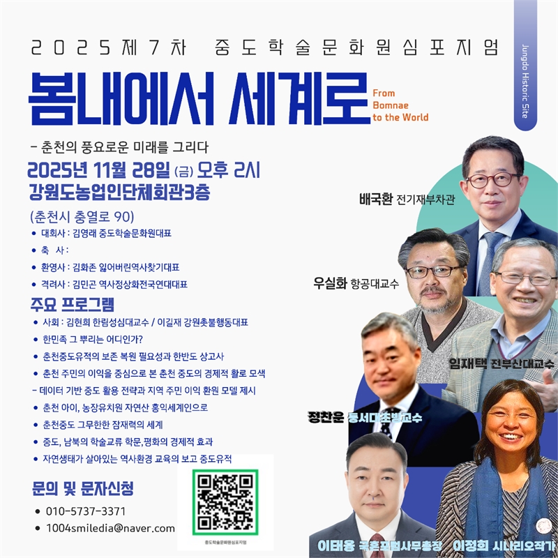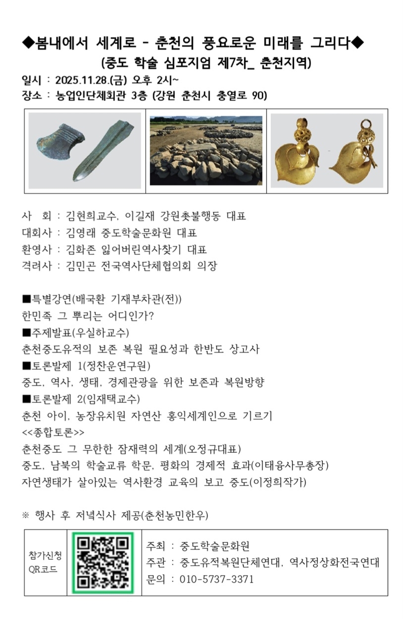 춘천중도지킴이 단체들은 서기 2025. 11. 28(금). 춘천시 충열로에 위치한 농업인단체회관에서 ‘봄내에서-세계로 춘천의 풍요로운 미래를 그리다’를 주제로 중도학술발표회를 개최한다.