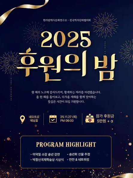 민족사학은 이러한 투쟁을 바탕으로 한 해를 결산하는 모임을 잇달아 갖는다. 먼저 한가람역사문화연구소는 서기 2025.11.27.(목). 한가람역사문화연구소 인근에 있는 한국교회 100주년 기념관 내 ‘네오트로 웨딩홀’에서 특별강연, 시상식, 선물 행사로 한해를 정리하고 새해 투쟁을 결의하는 송년회를 한다.