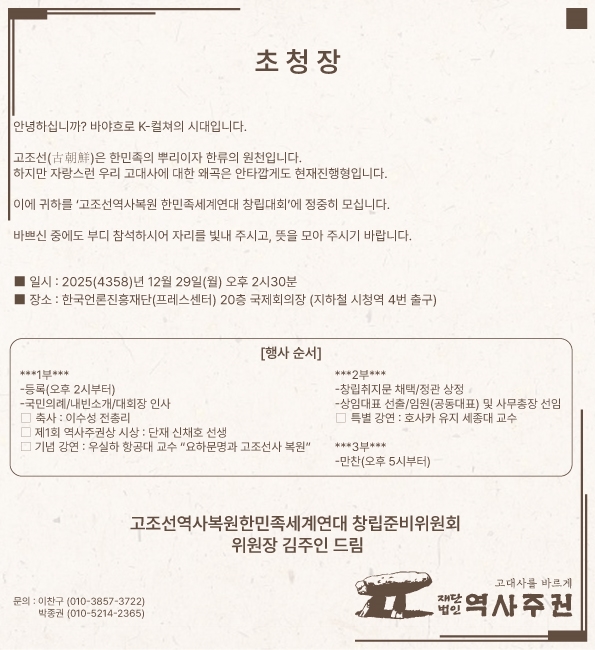 한편 역사주권(이사장 김주인)은 서기 2025.12.29.(월). 서울 전철 시청역에 위치한 한국언론진흥재단(프레스센터) 20층 국제회의장에서 ‘고조선 역사복원 한민족세계연대창립대회’ 갖는다. 1부에서는 이수성 전 국무총리가 축사하고 역사주권상 시상식에 이어 우실하 항공대 교수가 ‘요하문명과 고조선 복원’을 주제로 강연을 한다. 2부에서는 창립취지문 채택 및 정관을 상정하고 상임대표와 사무총장을 선임한다. 이어 호사카유지 세종대 교수가 특별강연을 한다.